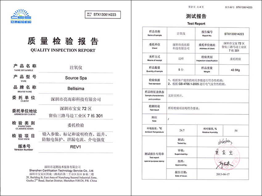 Source Spa注氧仪 质检报告